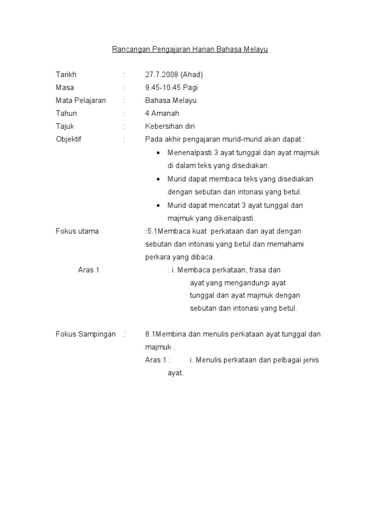 Doc Rancangan Pengajaran Harian Bahasa Melayu Tahun 1 Mem Mm Academia Edu