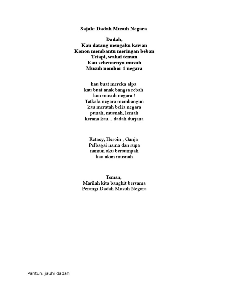 Sajak Dadah Musuh Negara Dadah Kau Datang Mengaku Kawan Konon Membantu Meringan Beban Tetapi Wahai Teman Kau Sebenarnya Musuh Musuh Nombor 1 Negara