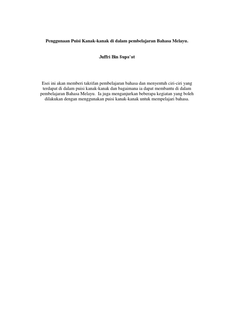 Penggunaan Puisi Dan Pantun Di Dalam Pembelajaran Bahasa Melayu Untuk Kanak