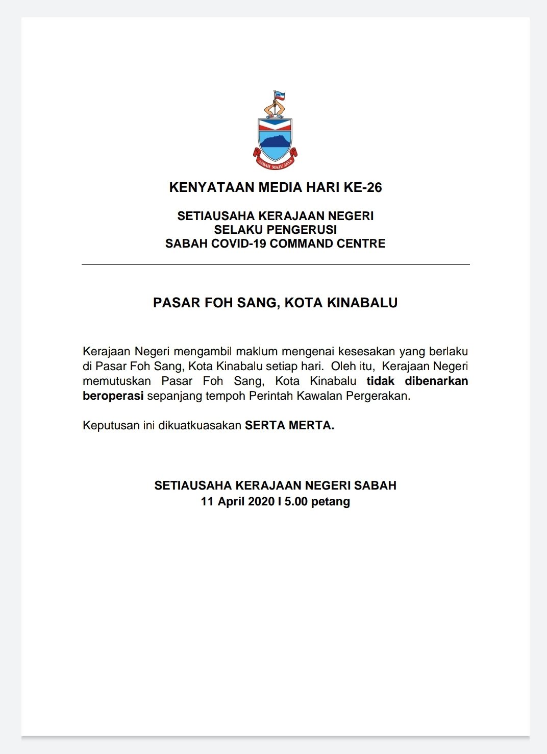 Jabatan Penerangan Negeri Sabah On Twitter Makluman Kenyataan Media Hari Ke 26 Setiausaha Kerajaan Negeri Selaku Pengerusi Sabah Covid 19 Command Centre 11 April 2020 5 00 Petang Sumber Setiausaha Kerajaan Negeri