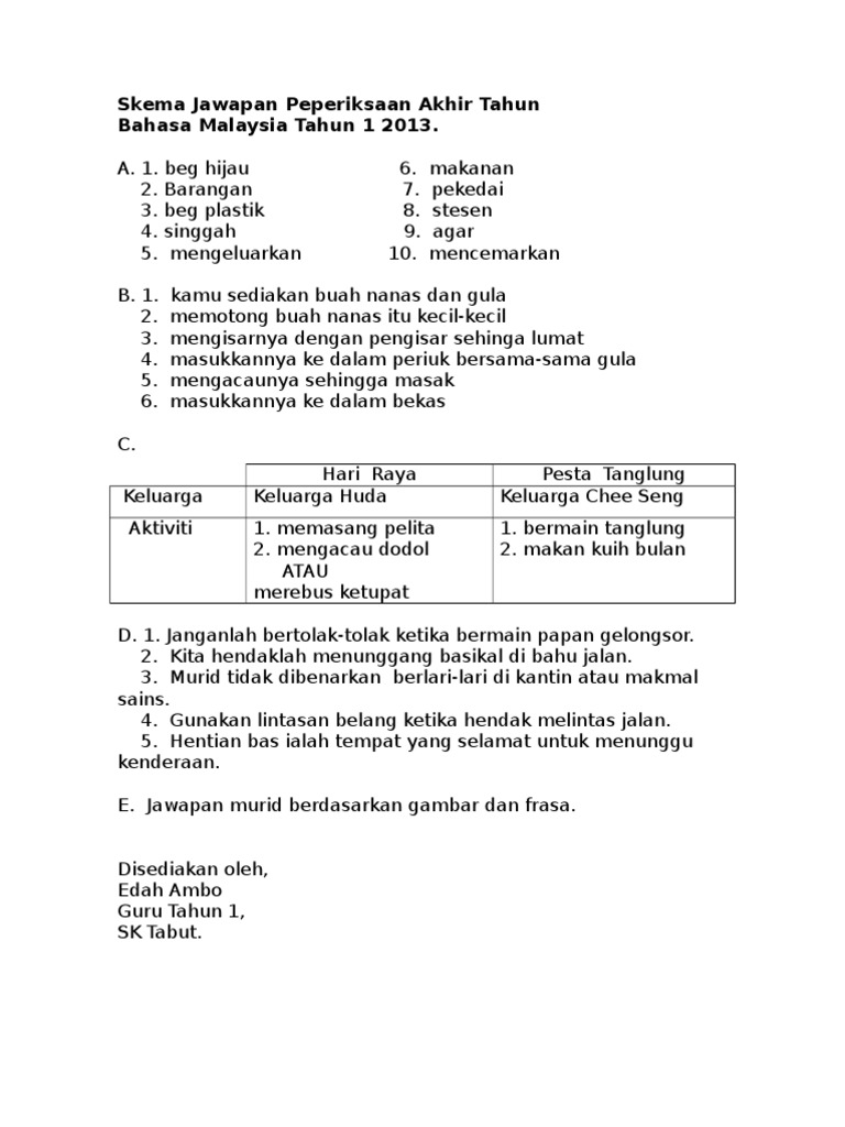 Jawapan Ujian Akhir Tahun Kssr Tahun 1 Bahasa Melayu Pemahaman