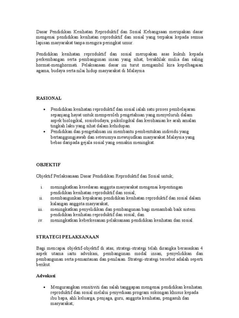 Dasar Pendidikan Kesihatan Reproduktif Dan Sosial Kebangsaan Merupakan Dasar Mengenai Pendidikan Kesihatan Reproduktif Dan Sosial Yang Terpakai Kepada Semua Lapisan Masyarakat Tanpa Mengira Peringkat Umur