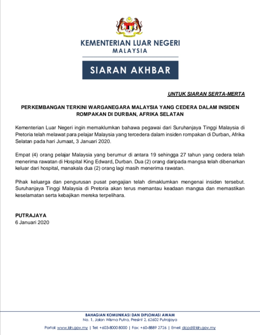 Wisma Putra On Twitter Press Release Update On The Condition Of 4 Malaysian University Students Following The Recent Armed Robbery In Durban South Africa 2 Victims Have Been Discharged From The Hospital
