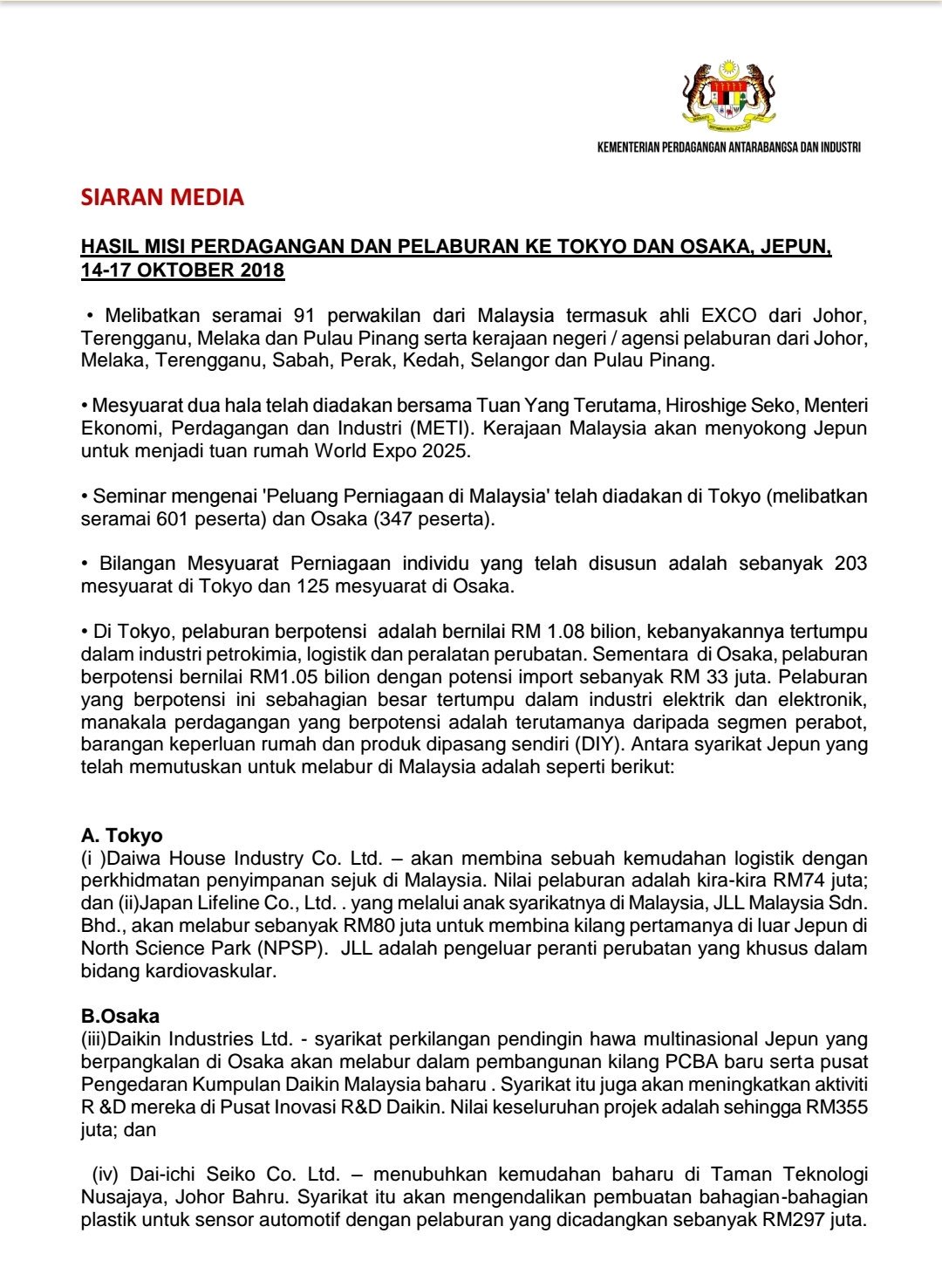 Miti Malaysia On Twitter Media Release Outcome Of The Trade And Investment Mission To Tokyo And Osaka Japan 14 17 Oct 2018 Darellleiking Imokman Ishamishak2 Officialmida Matrade Meti Jpn Https T Co Opuyz0ruoi