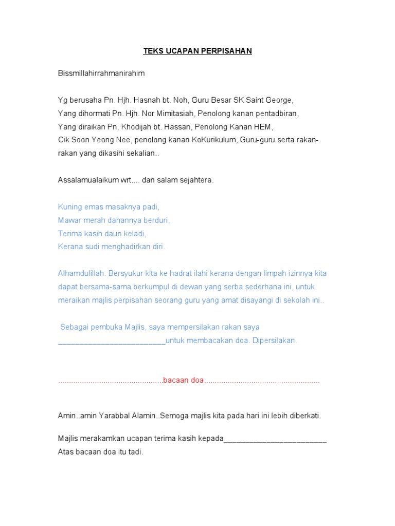 Teks Ucapan Perpisahan Guru Penolong Kanan