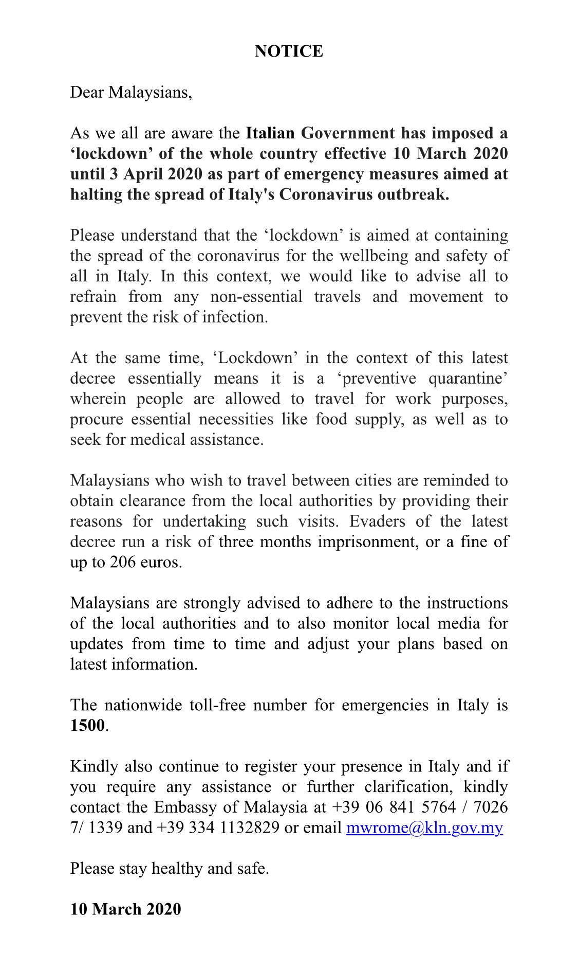Embassymalaysiaitaly On Twitter Notice For Rakyat Malaysia In Italy