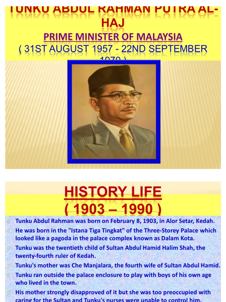 Bibliografi tunku abdul rahman putra al haj isbn 967 931 132 5 1. Tunku abdul rahman putra al haj ibni almarhum sultan abdul hamid halim shah 8 februari 1903 6 disember 1990 merupakan ketua menteri persekutuan tanah melayu dari 1955 dan perdana menteri pertama sejak kemerdekaan pada tahun 1957 sehingga 1970. His mother was the sixth wife of sultan s sixth wife and the daughter of siamese nobleman luang naraborirak kleb a thai district officer during the reign of king rama v of thailand. Abdul rahman was born on 8 february 1903 in istana pelamin alor star in kedah to the 24th sultan of kedah sultan abdul.