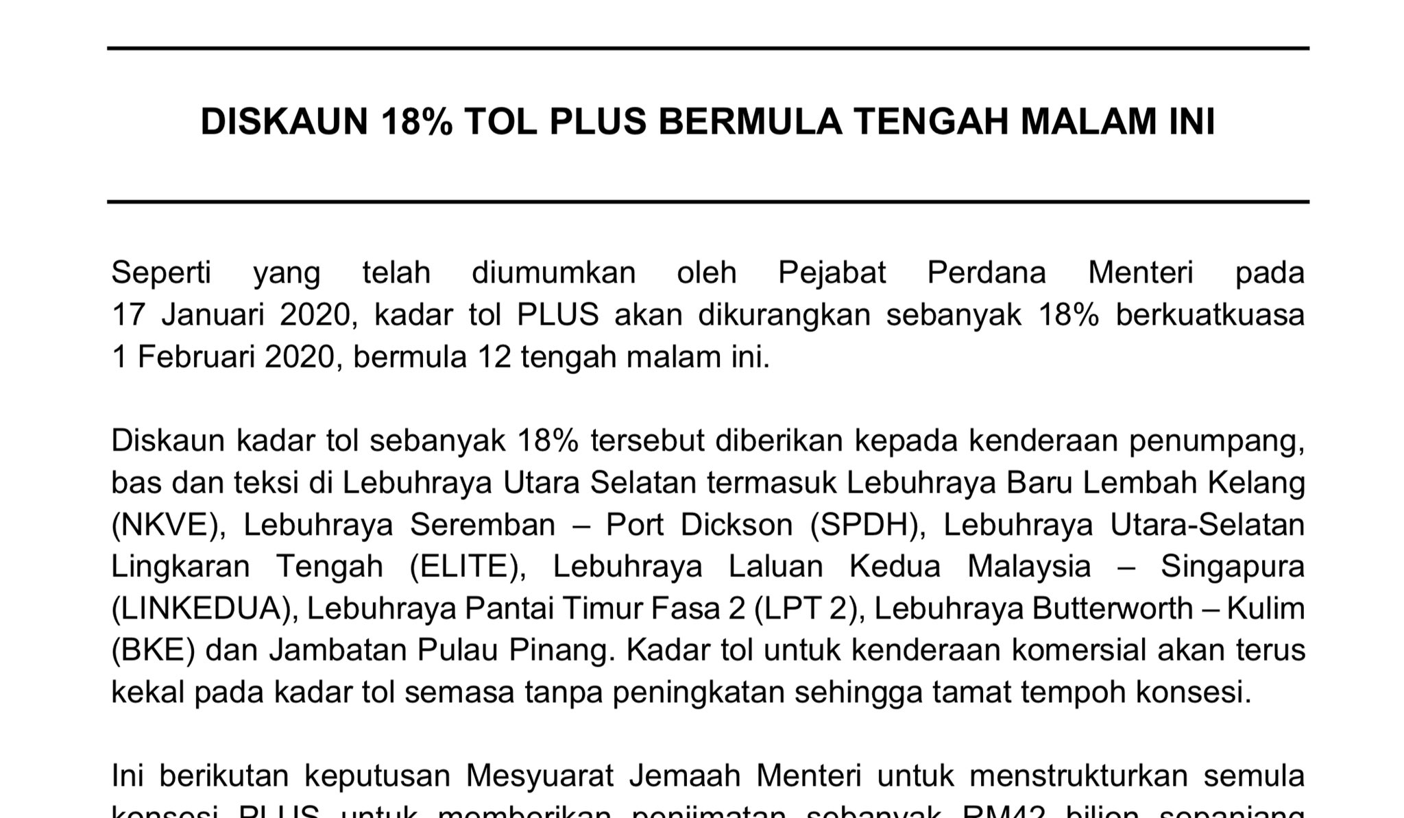 Plus Highway Tolls Extra 18 Off From 1 February 2020 Onwards